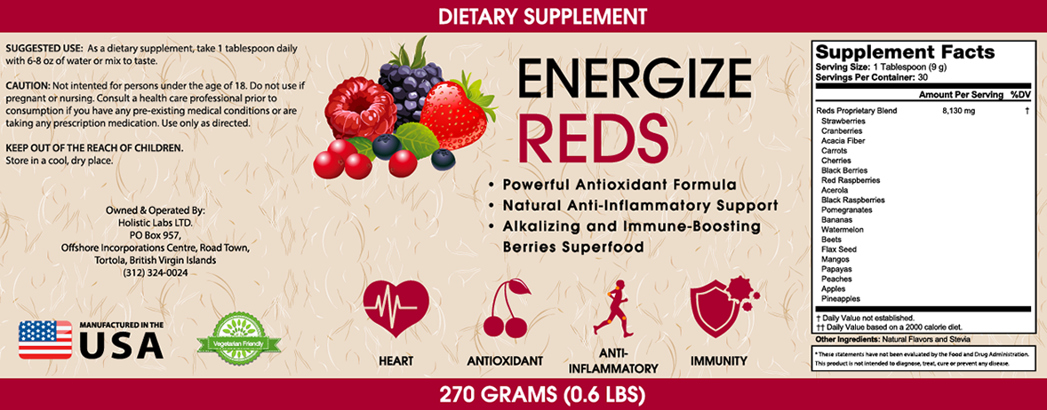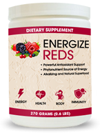 Energize Reds is a natural, proprietary mix of 19 berries and fruits to provide your body with rich antioxidants that your body needs to defend against inflammation, free radicals, and deadly diseases and illnesses.